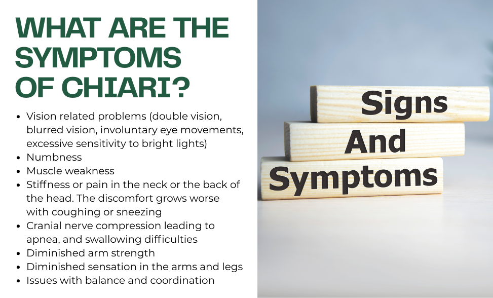 The symptoms of Chiari malformation and its severity vary from person to person. Many people who have a Chiari malformation do not show any signs of the disorder at all! This is often called an incidental, or asymptomatic Chiari. People with symptomatic Chiari can experience the following symptoms…