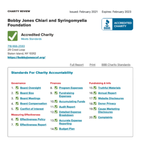 Bobby Jones CSF is the only accredited Chiari organization to have met all 20 standards of charity accountability.