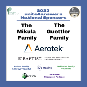 unite4answers is a collection of fundraising events around the country to help fund medical research and education programs that foster better answers. These events bring people together who are living with the devastating effects of Chiari malformation, syringomyelia, Ehlers-Danlos Syndrome and related disorders. You can read more about unite4answers here.