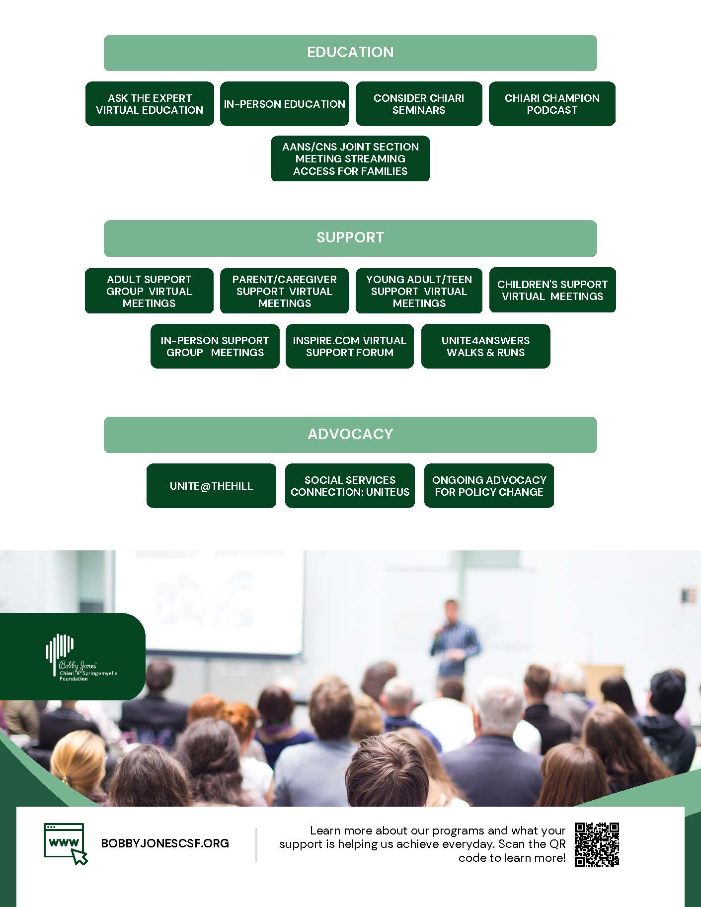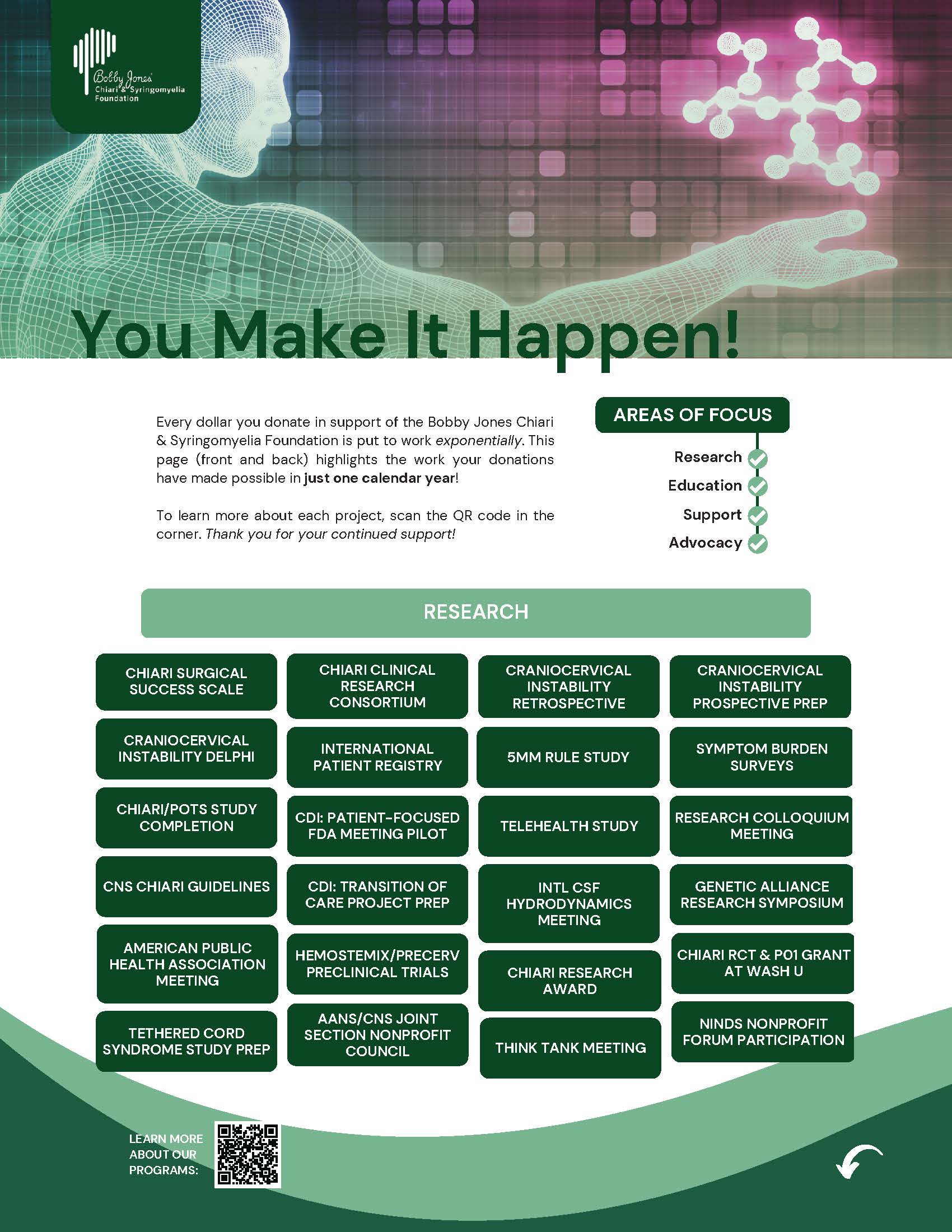 Planning this year’s Research Colloquium. Presenters are being invited for the 2023 Bobby Jones CSF Research Colloquium. The goal of this year’s meeting is to identify and discuss both neurosurgical issues as well as non-medical management of symptoms, including physical therapy, cognitive therapy, and pain management. More details to come!
